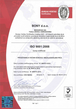 Standard ISO 9001:2008 potvrda je da se od ulaska sirovina u tvornicu do izlaska gotovog proizvoda poštuju radne procedure koje osiguravaju da kvalitet proizvoda bude na nivou najvećih evropskih i svjetskih proizvođača, da se poštuju pravila o zaštiti okoline i da se ostvaruje maksimalna ekonomičnost, što na kraju dovodi do manjih proizvodnih troškova i nižih cijena proizvoda na tržištu. U tome je dio tajne vrlo povoljne cijene Bony proizvoda.
